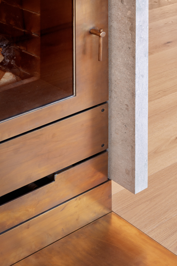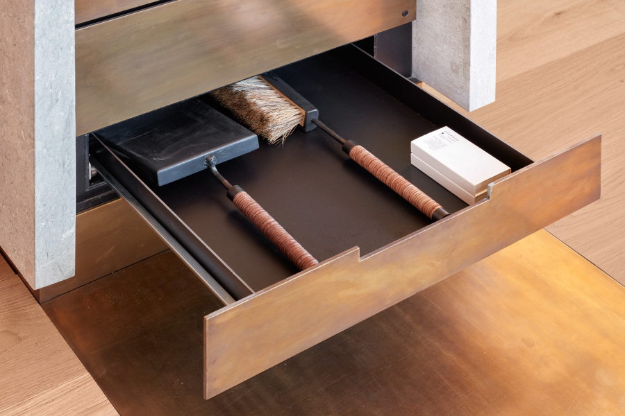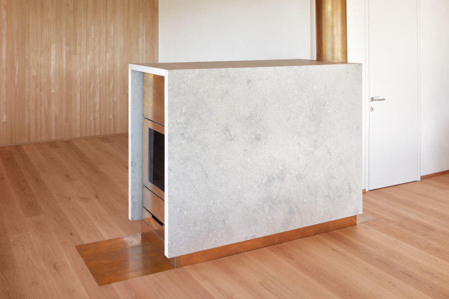 Kalkstein Avorio Grau, Messing brüniert, Schamotte